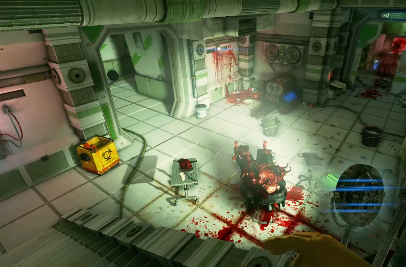 Vraiment, dans cette station il n’y a pas de demi-mesure. Soit les corps sont simplement coupés en deux, et trop grands pour les poubelles, soit ils sont en milles morceaux et ça prend une éternité à tout nettoyer. Sans parler des traditionnels morceaux de cadavre offerts par l’équipement bien sûr. Ou de l’élévateur qui déconne lorsqu’on l’active. On change pas une équipe qui gagne.